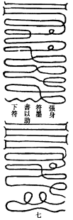 右安期先生绝谷符,丹书,绛三寸,封以小筒,系右臂令人不饥,强身,符下三符是也。