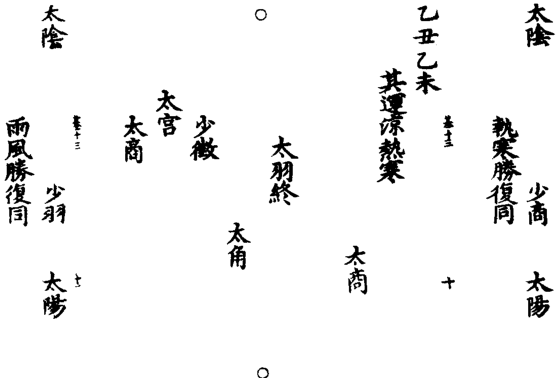 少阳(司天也,水还少阳,故为第五。)太羽(中见水运。)厥阴(下见厥阴木在泉也。)丙寅丙申(寅正化,申对化。)其运寒肃(运水当寒肃令。)其化凝惨凛冽(水太过,运行此化。凝,即冰冻也。惨,沉阴也。凛冽,即寒甚也。即运水胜天火。其变冰雪霜雹(令变非常气过也。德化冰凝布化,即霜雪杀化,即冰雹不待於冬。)其病寒浮肿(病本於肾,久及於心。)太羽终(丙寅丙申。丙水运,羽水音也。寅申阳年,故太羽。元首。)太角初(此丙寅生丁卯,丙申生丁酉。丁木运,角木音也。卯酉阴年不及,当少角,今太角者,即卯木岁会,即卯太酉少。此资生第二元也。)太徵(即丁卯生戊辰,丁酉生戊戌。戊火运,徵火音也。辰戌阳年太过,故太徵也。此资生第三元也。)太宫(此戊辰生己巳,戊戌生己亥。己土运,宫土音也。巳亥阴年不及,当少宫,今太宫者,即六巳在地户巳是也。此资生第四元也。)少商(此己巳生庚午,己亥生寅子。庚金运,角17金音也。子午阳年太过,今少商者,何也?谓午为火,少阴司天,◇18火即天刑之,故少商,此资生第五元也。)少羽终(此庚午生辛未,庚子生辛丑。辛水运,羽水音也。辛逢丙合水运羽。此六元还周,复见羽也。))