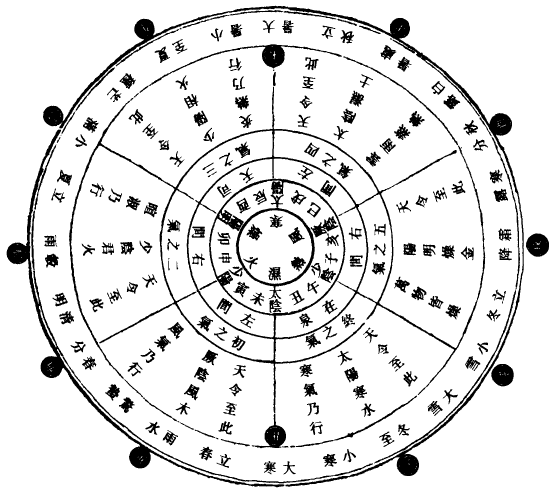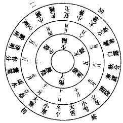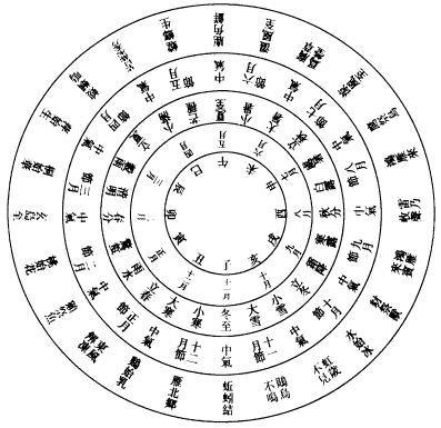 夫日一昼一夜,十二时当均分於一日。故上智设铜壶贮水,漏下浮箭,箭分百刻以度之。虽日月晦明,终不能逃,是以一日之中有百刻之候也。夫六气通主一岁,则一气主六十日八十七刻半,乃知交气之时有早晏也,故立此图以明之。立2夏日有长短之异,则昼夜互相推移,而日出入时刻不同,然则3於百刻矣,其气交之刻则不能移也。甲子之岁,初之气始於漏水下一刻,终於八十七刻半子正之中也;二之气复始於八十七刻六分,终於七十五刻戌正四刻也;三之气复始於七十六刻,终於六十二刻半酉正之中也;四之气复始於六十二刻六分,终於五十刻未正四刻也;五之气复始於五十一刻,终於三十七刻半午正之中也;六之气复始於三十七刻六分,终於二十五刻辰正四刻也。此之谓一周天之岁度,余刻交入乙丑岁之初气矣。如此而转至戊辰年初之气矣,复始於漏水下一刻,则四岁而一小周也。故申子辰气会同者,此也。巳酉丑初之气俱起於二十六刻,寅午戌初之气俱起於五十一刻,亥卯未初之气俱起於七十六刻,气皆起於同刻,故谓之三合者,义由此也。以十五小周为一大周,则六十年也。