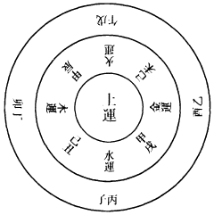 五音者,五行之音声也。土曰宫,金曰商,木曰角,火曰徵,水曰羽。在阳年则曰太,在阴年曰少。《晋书》曰:角,触也,象诸阳气触动而生其位,丁壬岁也。徵,止也,言物盛则止其位,戊癸岁也。商,强也,谓金性之坚强其位,乙庚岁也。羽,舒也,阳气将复,万物孳育而舒生其位,丙辛岁也。宫,中也,中和之道,无往而不理,又总堂室奥阼而谓之宫。所图不一,盖土亦以通贯於金木水火,王於四季,荣於四藏,皆总之之意也,其位甲己岁也。故五运从十干起,甲为土也;土生金,故乙次之;金生水,故丙次之。如此五行相生而转,甲为阳,乙为阴,亦相间而数,如环之无端。详其五音五运之由,莫不上下相召,小大相乘,同归於治而已。是故因刻以成日,因日以成月,因月以成岁,递相因以制用。虽太古占天望气,定位之始,见黅天之气横於甲己为土运,素天之气横於乙庚为金运,玄天之气横於丙辛为水运,苍天之气横於丁壬为木运,丹天之气横於戊癸为火运,则莫不有从焉。若以月建之法论之,则立运之因,又可见也。何哉?丙者火之阳,建於甲己岁之首,正月建丙寅,丙火生土,故甲己为土运,戊者土之阳,建於乙庚岁之首,正月建戊寅,戊土生金,故乙庚为金运。庚者金之阳,建於丙辛岁之首,正月建庚寅,庚金生水,故丙辛为水运。甲者木之阳,建於戊癸岁之首,正月得甲寅,甲木生火,故戊癸为火运。壬者水之阳,建於丁壬岁之首,正月得壬寅,壬水生木,故丁壬为木运。是五运皆生於正月建干,岂非日月岁时相因而制用哉。