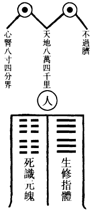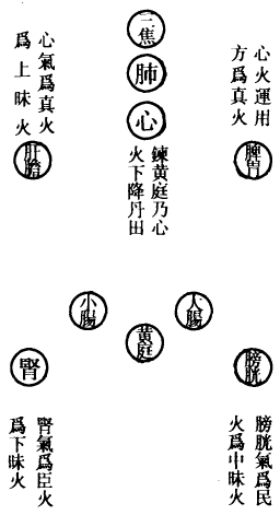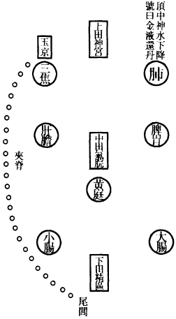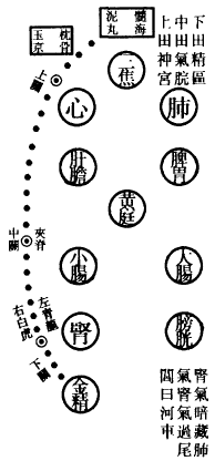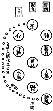 肺为华盖,咽喉为重楼,口为玉池兑户,鼻为天门天柱,眉间为玉堂,额为天庭,顶为天宫,耳为双市门。肾气传肝气,肝气传脾气,脾气传肺气,肺气传心气,心气传脾气,脾气传肾气,是为五行循环,而曰小还丹也。上田入中田,中田入下田,三田返复,而曰大还丹也。