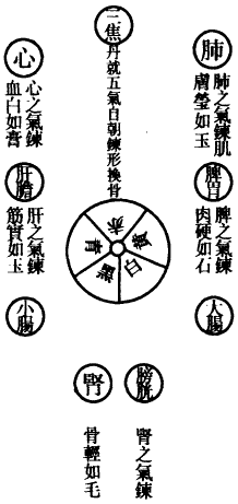 右四时有暇便行。升腰不动,丹中五气纷纭内起,正坐不偏,丹中五气纷纭四出。肾之真气炼骨,身轻如毛,可以乘风御雾。肝之真气炼筋,实如玉,可以走趁奔马。心之真气炼血,白如膏,可以永耐寒暑。肺之真气炼肌肤,莹如雪,可以换骨易形。脾之真气炼肉,硬如石,可以化气如金。始自丹成,五气朝真,气聚而不散。次用前法而般运,内传五藏,外遍四肢。五气炼形,凝而不衰,号曰形神俱妙,与天齐年。