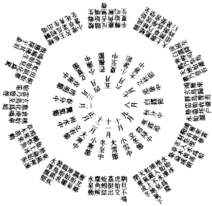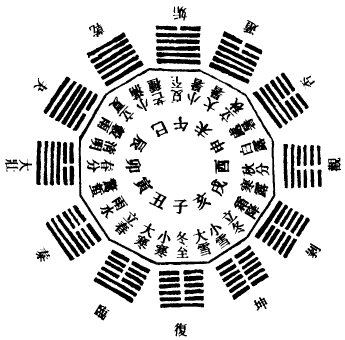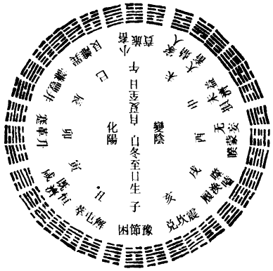 冬至之月,一阳始生而成复卦。大寒之日,二阳始生而成临卦。雨水之日,三阳始生而成泰卦。春分之日,四阳始生而成大壮卦。谷雨之日,五阳始生而成夬卦。小满之日,纯阳而成乾卦。夏至之日,一阴始生而成姤卦。大暑之日,二阴始生而成遁卦。处暑之日,三阴始生而成否卦。秋分之日,四阴始生而成观卦。霜降之日,五阴始生而成剥卦。小雪之日纯阴,坤卦用事。所谓损之而益,益之而损也。