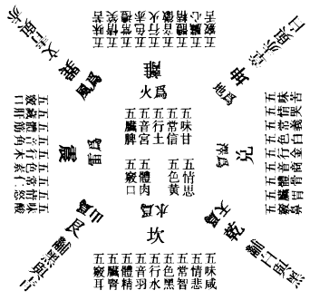五行悉备,三才众象之宜,八卦四维之属,以明变化之功。有类一方之所,自有生克而为顺逆之时。且如目主肝,以情怒者,必可以引金。金主肺,以情哭而诫劝,因此自相感而为相克之胜负。若不以金则用火,火主心,以情笑而接之,其怒情渐去者,为相生之故也。他皆仿此,以明五行顺逆生克之道也。