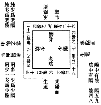 夫四象者,重明天地日月之道,六七八九之数。如乾之老阳称九,坤之老阴称六,乾之少阳称七,坤之少阴称八。故知乾有六爻,爻各称九,以四因之,爻别三十六策。坤有六爻,爻各称六,以四因之,爻别二十四。乾阳爻一百九十二,坤阴爻一百九十二,总之得万有一千五百二十之策,当万物之数也。