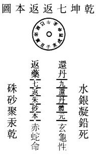 七返朱砂返本,丹须日用烹煎。坤宫药物采归乾,黑虎赤龙相见。泰否调和得一,中庸三五还元。灵光射透九重天,静处当峰月现。