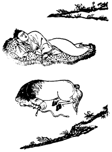 (天生良善性,不废牧童心。闲倚枯松坐,逍遥自在吟。)