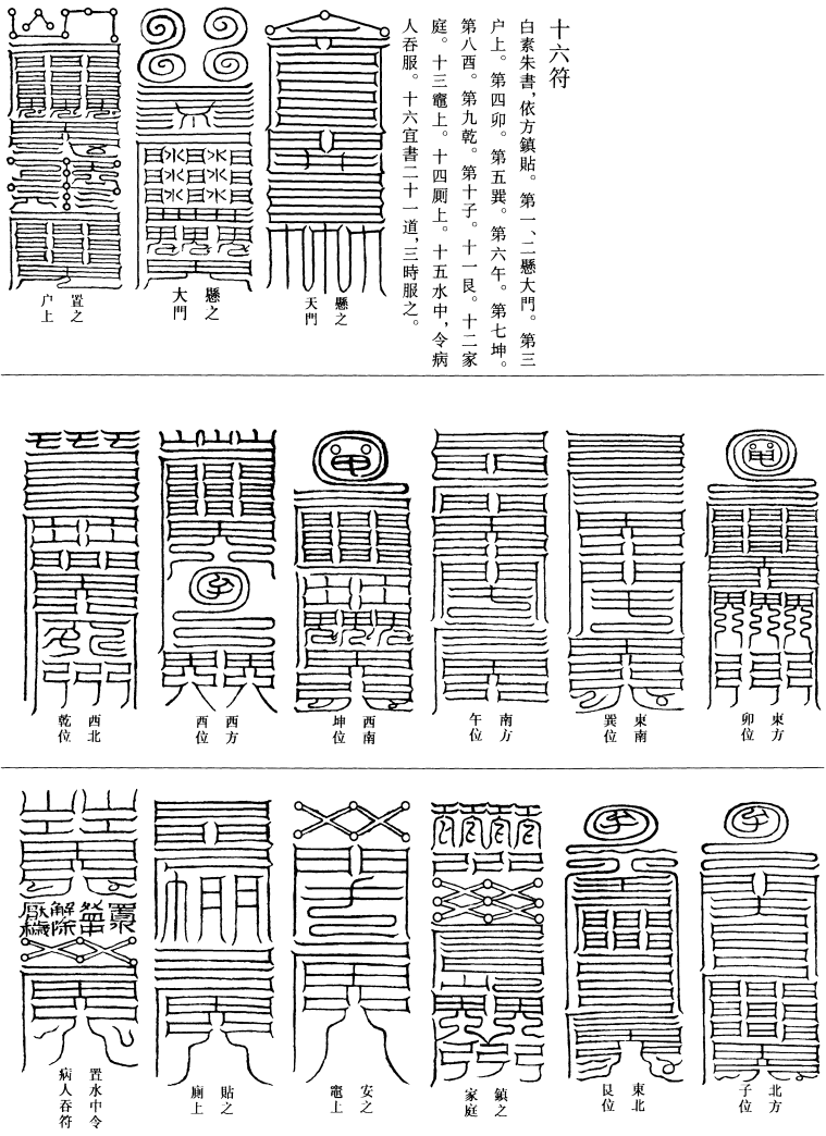 道言:道士若有隐山谷,或在人间,当一心救济百姓危厄困笃者,为其转经行道,一日三时。行道转经一日三日讫,当即为中庭北向,上大驱除宝章一通,并佩九天大箓神符,绢素书之,佩服神符,令病人速得瘥愈,人鬼无他,一一解除了了。是诸鬼神,各各为道士收瘟摄毒,助其道士救病来焉。