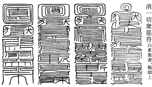 道言:道士当书神章,投泉绝厌,镇天下百魔之处,不问大小,转经行道,并上大驱杀宝章,口启吏兵。为此符,朱书。