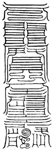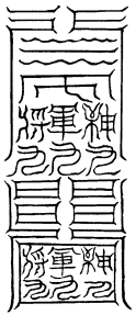 北帝曰:八字灵篆,若下元生人有疾在腹者,以墨书,水吞之一字,加持神咒。至此八字,即得消散。若疾在外者,当静思神力,以墨书其肉上且书第一字。若未消散,更於其侧书第二字,大都不过三字,无不退散。告诸真子,忆而奉行。
