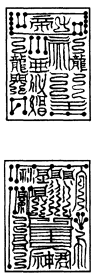 右二印。一曰北极杀鬼印,治一切疾病。一曰北极酆都召鬼神印,若世人被恶鬼、山魈、古怪所加,使人狂言,或入水火者,以印印病者心上,病人悉能言为患之鬼,其病立差。