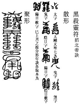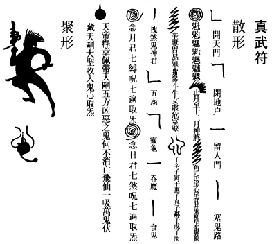 真武,身长百尺,散发,金鏁甲胄。足踏五色灵龟,又名螣蛇八卦之龟。按剑,立眼,如电光。凡用真武符,即取气,以为功曹注入笔头墨砚中,后以斗诀书之。左右执旗戟共九人,同乘黑云。
