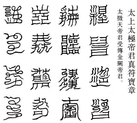 此太极帝君真符,上元六符,中元五符,下元五符。太上召三一守形之法,立春、春分、立夏、夏至、立秋、秋分、立冬、冬至始日,朱书,平旦向王,服一符,以次十六日,竟服十六符也。后节复如先,从上起服也。服符悉向王再拜,咒曰: